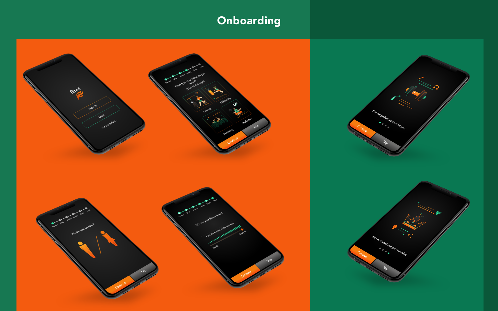Onboarding is one of the key factors that can make or break user retention in an app. Fitted uses an extensive and easy to use onboarding section to collect user information and permissions, should the user allow access to information. The information collected personalizes the app and allows for a richer experience. This section also indicates to the user the benefits of using the app, while also giving a quick glimpse of functionality. To this end, I used benefits oriented onboarding.